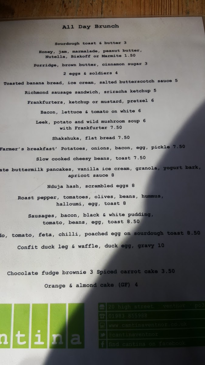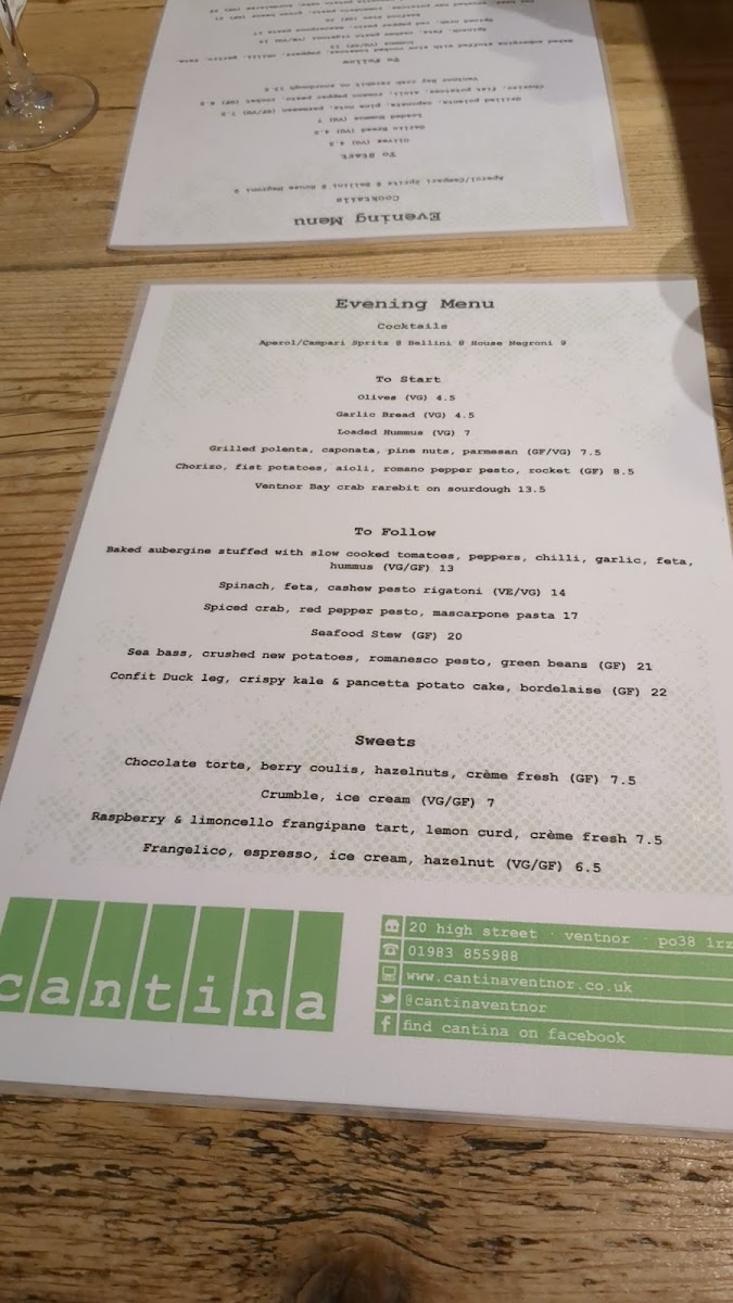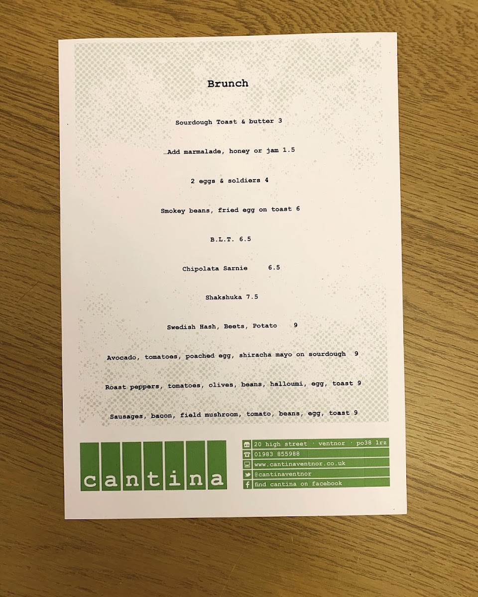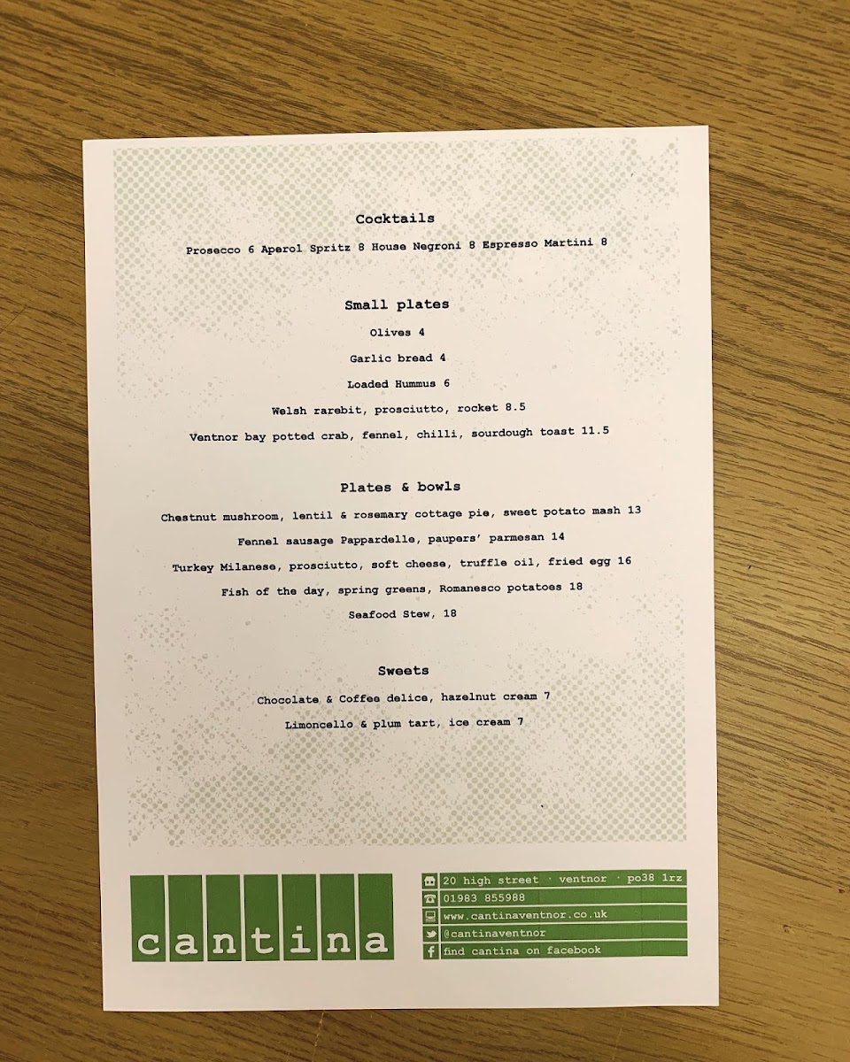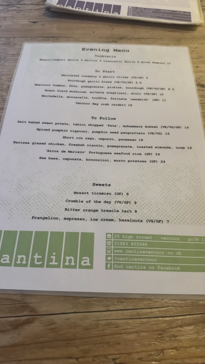 From a reviewer’s perspective, the menu at Cantina Ventnor, located at 20 High St, Ventnor PO38 1RZ, United Kingdom, feels like a confident and well-rounded celebration of comfort food with Mediterranean influences, thoughtfully structured to suit any time of day. The brunch and all-day brunch options, such as Sourdough Toast & Butter, Shakshuka, Swedish Hash, Spanish Eggs, Porridge with Brown Butter and Cinnamon Sugar, and 2 Eggs & Soldiers, provide a relaxed yet satisfying start, while indulgent choices like Toasted Banana Bread with Ice Cream and Salted Butterscotch Sauce add a sweet touch. The cake selection, including Toasted Banana Bread with Butter, Lemon and Polenta with Lemon Curd, and Tart of the Day, pairs naturally with the casual atmosphere. Moving into the main menu, small plates and starters such as Olives, Garlic Bread, Loaded Hummus, Garlic Chestnut Mushrooms with Rocket and Sourdough Toast, Welsh Rarebit, and Prosciutto with Rocket set the tone for sharing and exploration. The heart of the menu shines in the “To Follow” and “Plates & Bowls” sections, where comforting, rustic dishes like Hazelnut & Mushroom Trofie, Fennel Sausage Pappardelle with Paupers’ Parmesan, Chestnut Mushroom, Lentil & Rosemary Cottage Pie with Sweet Potato Mash, Turkey Milanese with Prosciutto, Parmesan, Truffle Oil and Fried Egg, Seafood Stew, and Fish of the Day with Spring Greens and Romanesco Potatoes highlight both land and sea. Desserts such as Chocolate Fondant with Salted Caramel and Ice Cream, Apple Crumble with Ice Cream, and Limoncello & Plum Tart with Ice Cream round things off on a comforting note. Complemented by classic cocktails like Aperol Spritz, Bellini, and House Negroni, along with a concise yet international wine list featuring Prosecco Vino Spumante, Fiano, Viognier, and Chardonnay, the menu as a whole leaves the impression of a restaurant that values simplicity, quality ingredients, and broad appeal-an inviting conclusion to a thoughtfully curated dining experience.